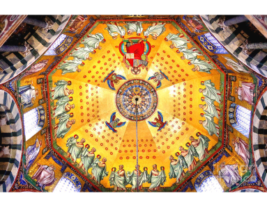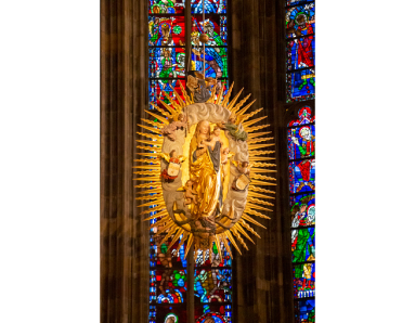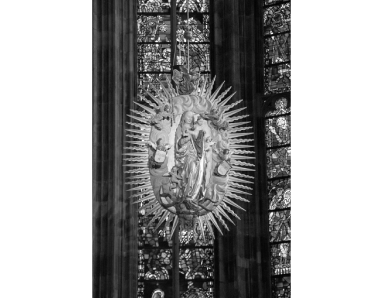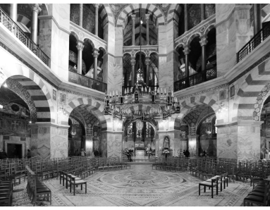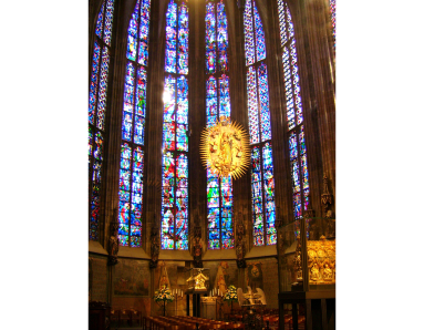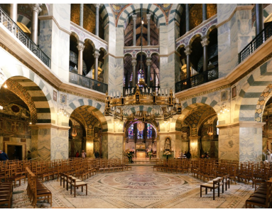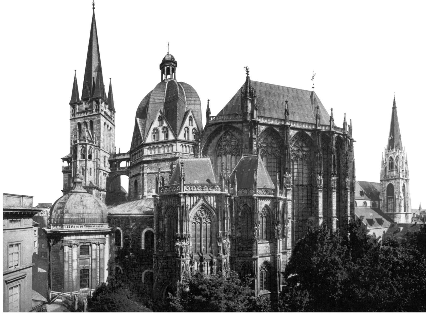 Restoration at Charlemagne’s Palatine Chapel at Aachen began relatively quickly, in 1949. By 1951, all the windows in Aachen’s so-called Glashaus (a fourteenth-century choir borrowed implicitly from Paris’ Sainte Chapelle) received new glazing in a neo-Byzantine type of expressionism, by Walter Benner, and patterned geometric designs by Anton Wendling.